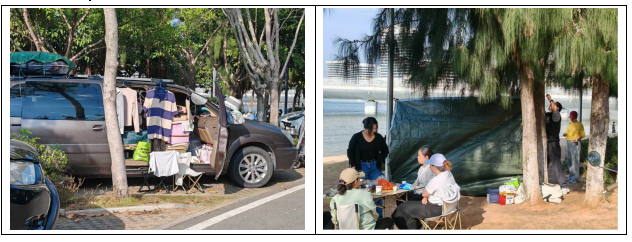 本次巡查重点围绕停车秩序、市容卫生、公厕管理、园林绿化等情况,查看部分公园、停车场、草坪等露营较为集中的点位,共巡查点位10个,发现问题49个,其中较为突出的问题:一是市容秩序混乱,如五缘湾湿地公园、白鹭洲东侧公园、梅海岭公园内部分区域存在乱堆杂、私占停车位、非机动车乱停放等现象;二是园林绿化受损,海湾公园、玩月坡部分草坪区域大面积枯黄,甚至出现黄土裸露现象;三是环境卫生状况较差,如五缘湾湿地公园露营人员聚集区垃圾桶满溢、白鹭洲东侧公园露营车辆停放区域周边绿地内积存垃圾和生活污水乱倾倒等问题。