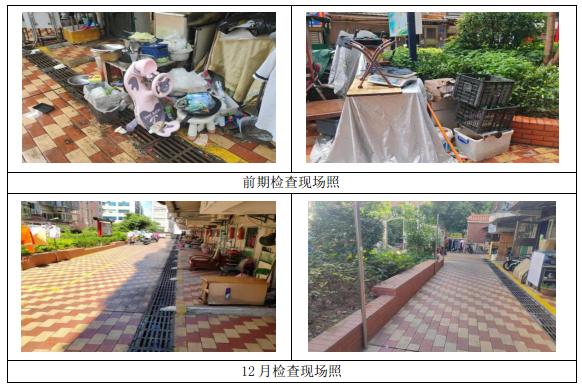 事务中心在前期精细化监督检查过程中发现,徐厝社区在日常管理上存在薄弱环节,垃圾积存、杂物乱堆放等问题较为突出,精细化管理不到位。检查组随即形成“问题清单”,派发通报督促整改,并针对徐厝社区的硬件老化、管理难度大的特点,指导社区建立常态巡查与联动治理机制,从源头推动问题整治。同时,中心紧密结合常态化巡查和实地核查工作,多次动态跟踪社区管理情况和指导长效管理的落实,有效提升社区的管理成效。在12月份的抽查结果显示,同类问题显著减少,尤其在物品堆放秩序、绿地卫生保洁等薄弱环节的管理成效显著提升,居民生活空间更加清爽、有序。